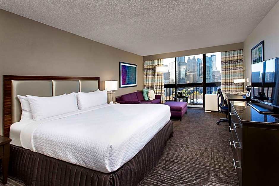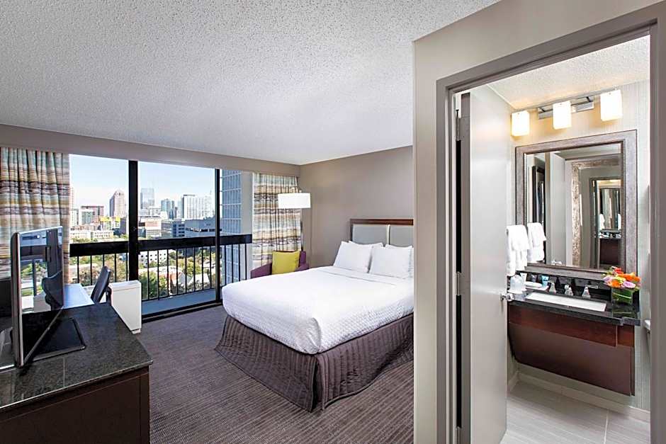 This room includes a flat-screen TV, work desk with an ergonomic chair and a Keurig coffee maker.